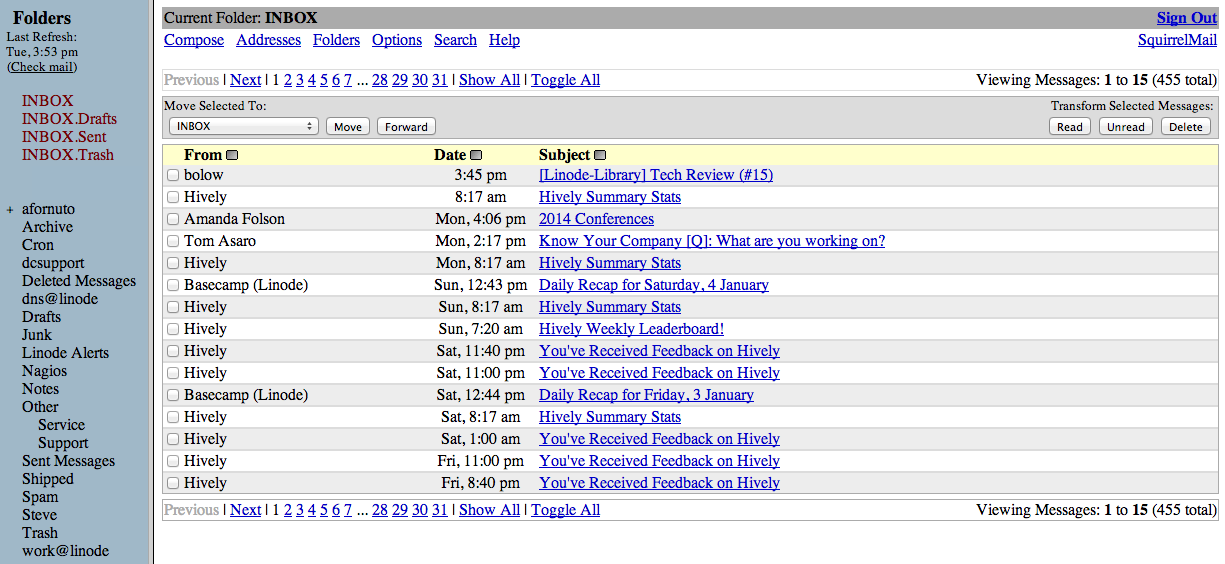 At this point you should be able to log in to the SquirrelMail Login page using your email credentials. Navigate in your web browser to the Linode’s IP address, or domain name depending on how you’ve configured the virtual host: