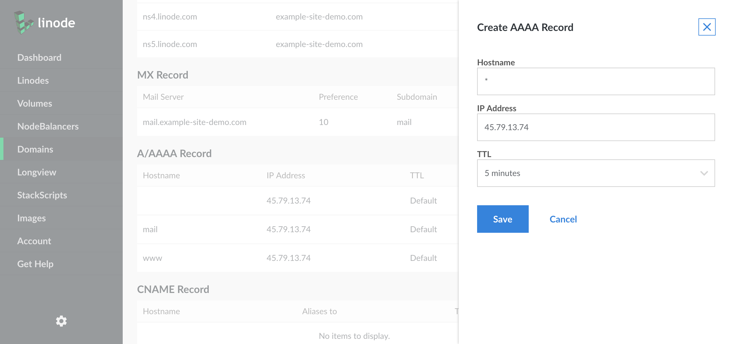 The most common DNS configuration is a single domain name on a single Linode. For this, you’ll need to add SOA and NS records for all of your name servers, and A/AAAA records for your domain names. Use the screenshot below as a guide.