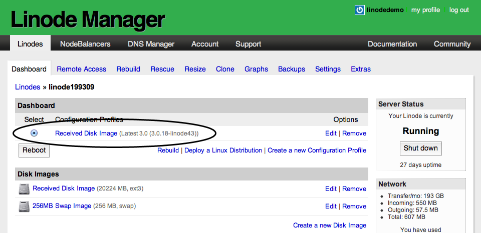 Now to start the receiving Linode from the transferred disk, you’ll need to select the configuration profile you just created. Here’s how: