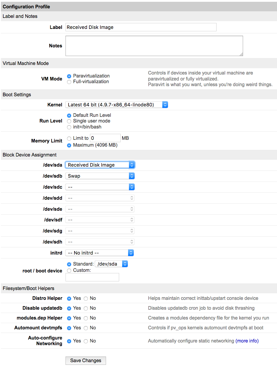 The boot the receiving Linode from the transferred disk, you’ll need to create a new configuration profile. Here’s how: