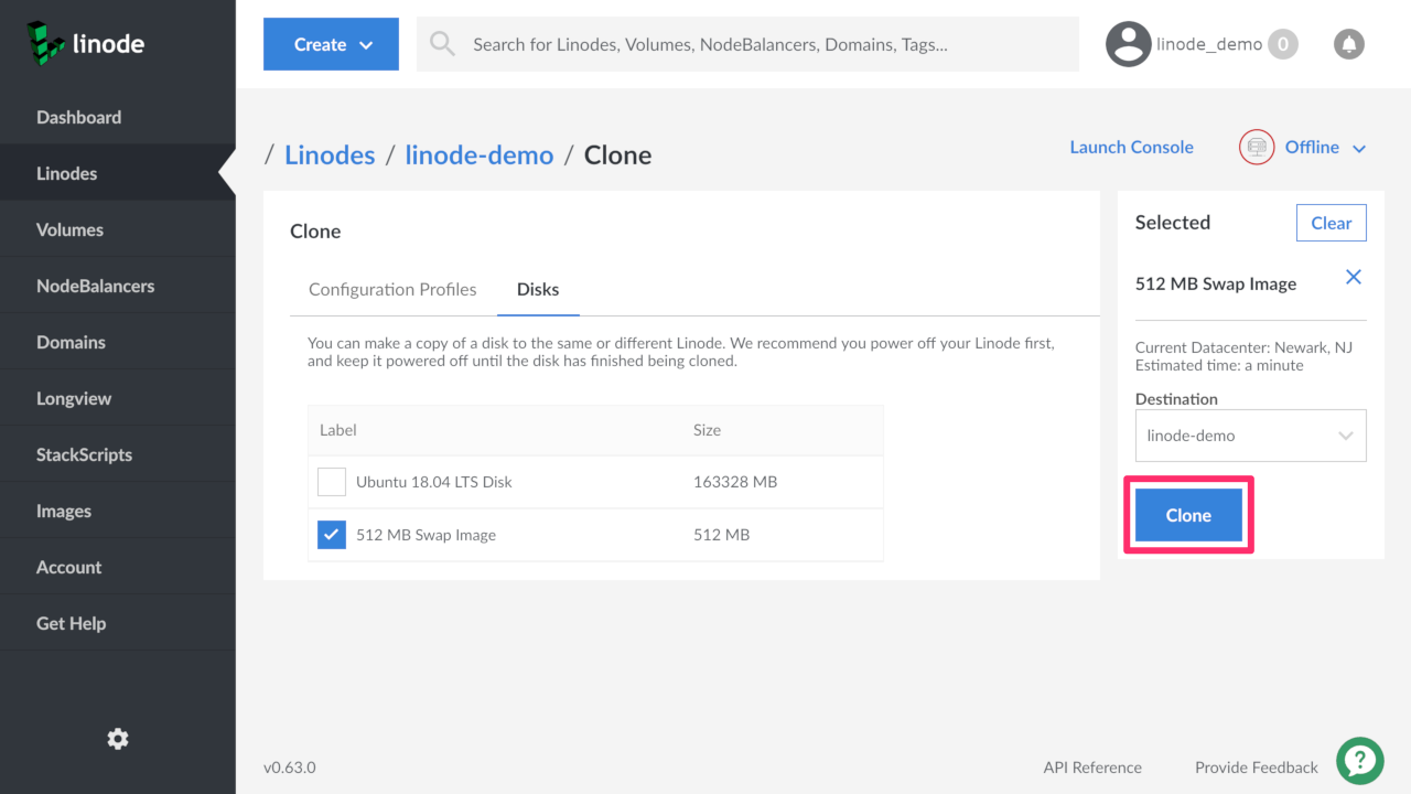 We recommend that you power off your Linode first, and keep it powered off until your disks have completed the cloning process.