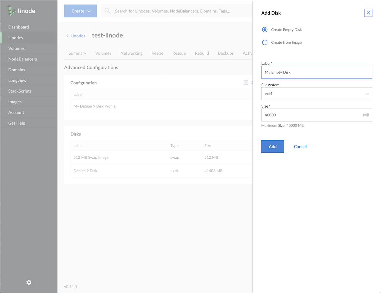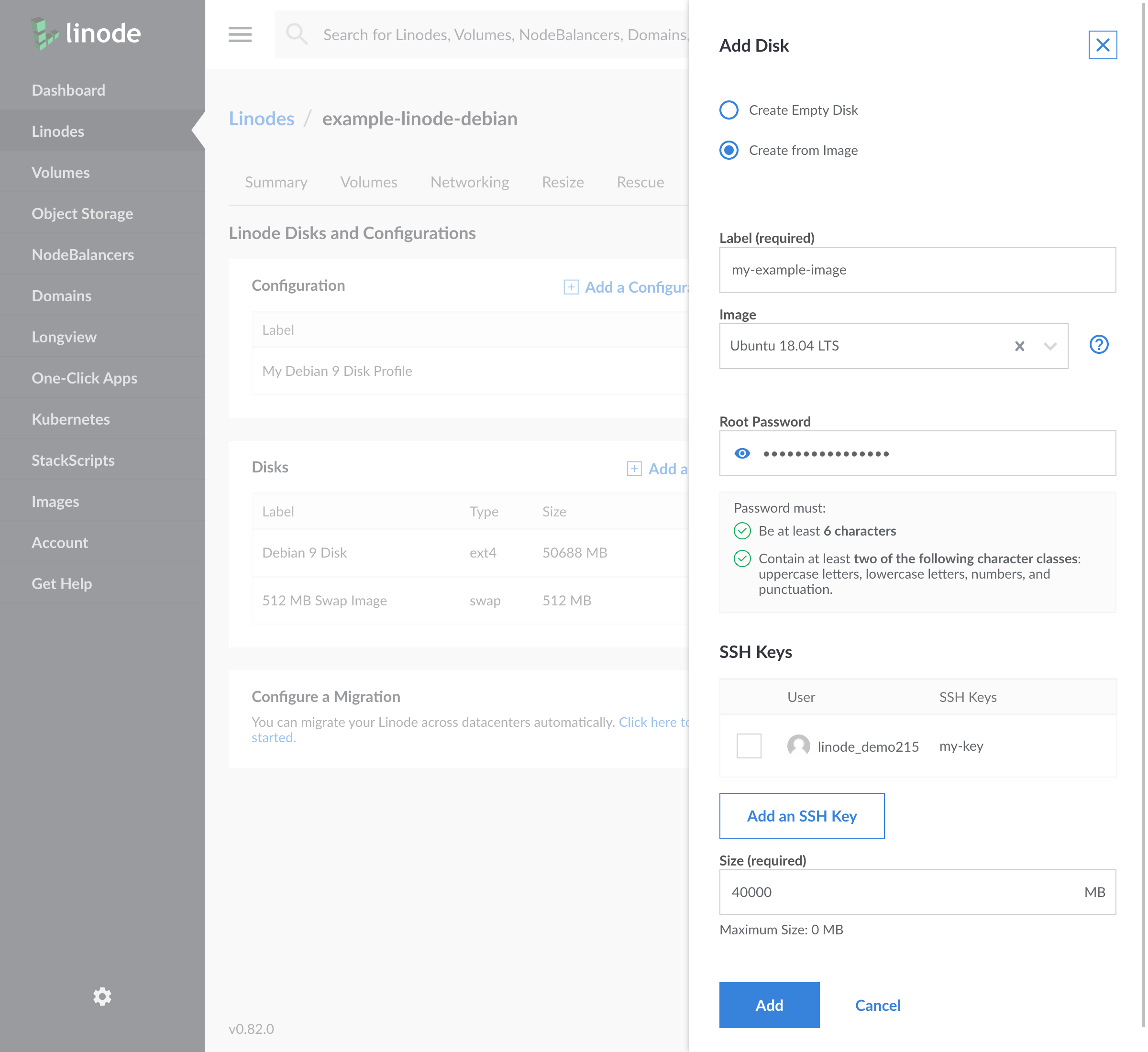 8. Enter a size for the disk in the Size field. The size must be smaller than the amount of storage space remaining in your Linode plan.