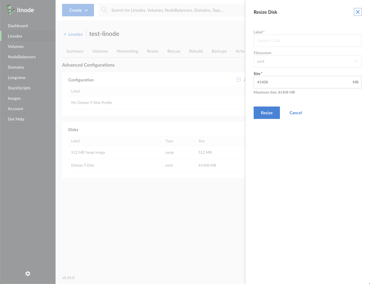Resizing a disk requires you to power your Linode off, if it is currently in use by your Linode. Shrinking a disk takes longer than increasing its size.