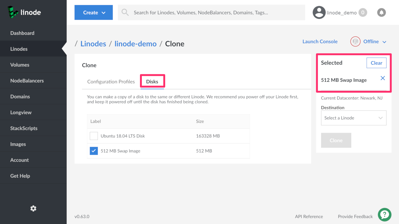 You can delete a disk to remove it from your Linode and reallocate its storage space to another disk. Here’s how to delete a disk: