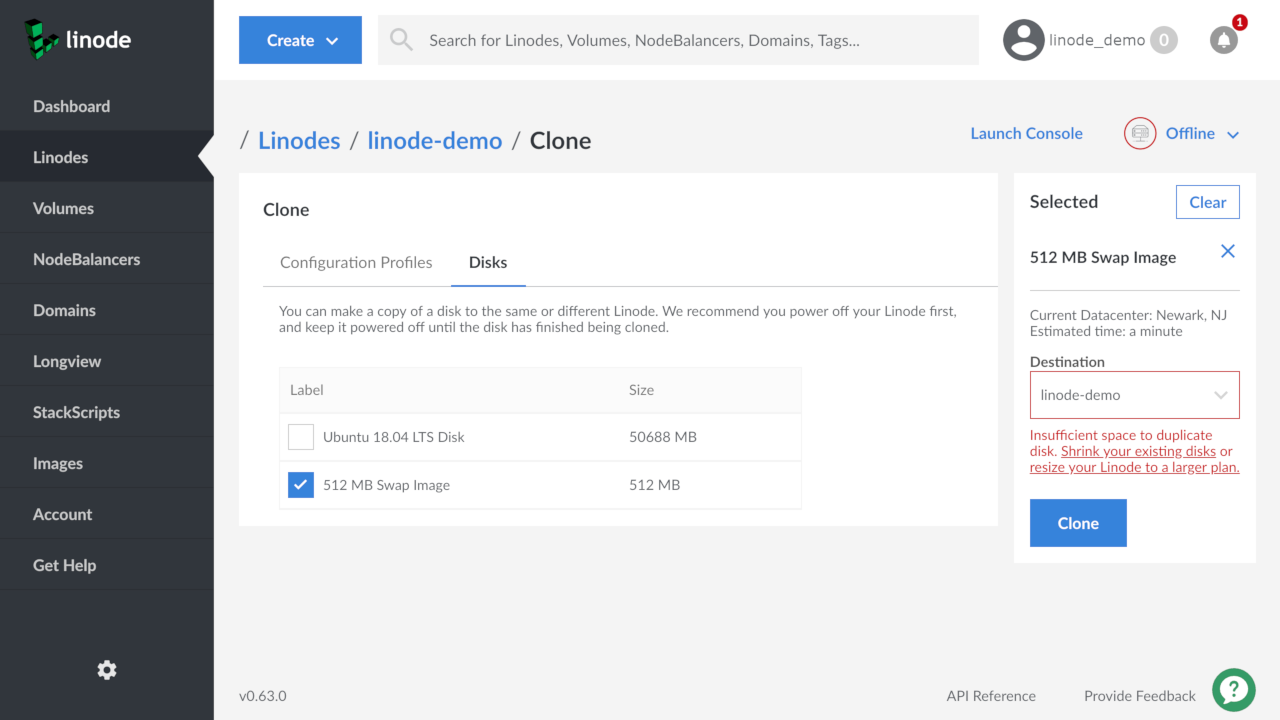 If your Destination Linode is not large enough for your clone, you will see a warning and be unable to continue until the Linode has the required space available. Size Error Message
