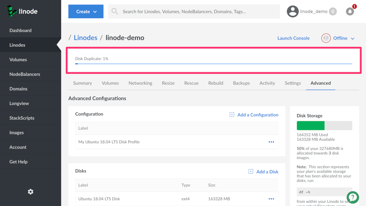 11. When the cloning process is complete, your new disk or configuration appears in the Linode’s Disks/Configs tab.