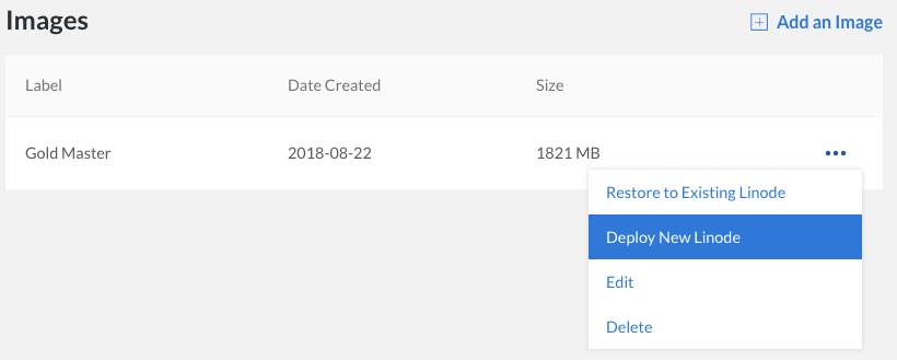 Navigate to the Images page, click on the more options ellipsis to open the menu for the Image from which you would like to deploy, and select Deploy New Linode.
