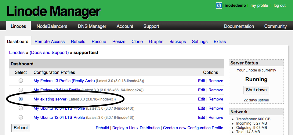 Now it’s time to boot your Linode from the new disks. All you have to do is select the new configuration profile you created and then restart the Linode. Here’s how: