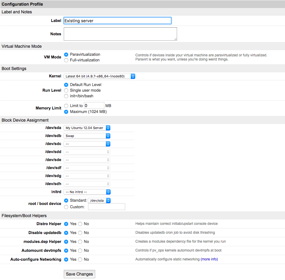 After the network copy is complete and the files from the existing server have been moved in to the disks, you’ll need to update the existing server’s IP address and network configuration with your Linode’s IP address and network settings. Here’s how: